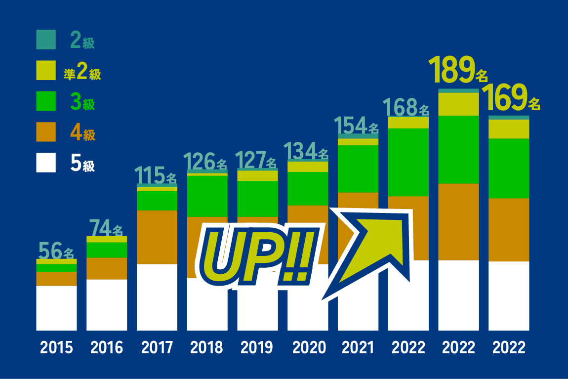 2015年に英語カリキュラムを改訂して以降、英検合格者が年々拡大しています。全校生徒の約70%が英検を取得し、3級以上(中学卒業レベル)の取得者は約40%にのぼります。