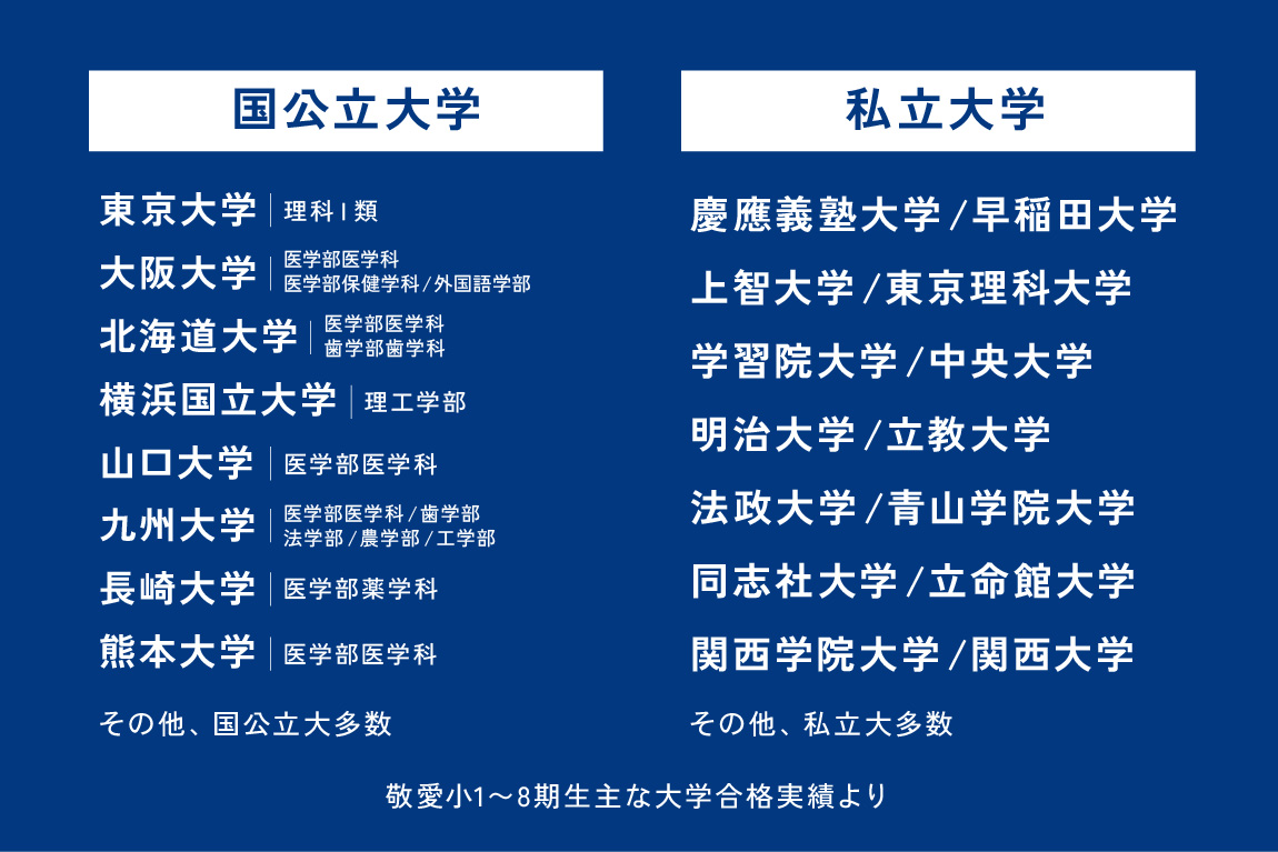 敬愛小学校では、多くの卒業生が国公立大学・有名私立大学へ進学。敬愛ならではの「学ぶプロセス」を大切にした学習指導で一人一人の目指す未来へ。